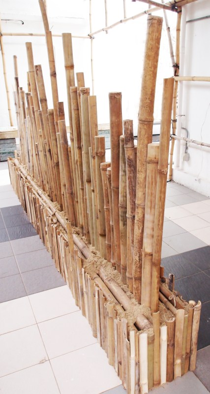 Cracking a bamboo trunk is a way to deconstruct its natural form; percussing it, to create noise. The cracking is likely to make humans understand their physical world and the percussing is likely to cause an emotional catharsis from the bottom of their heart. Slash downwards from one of its end with a striking stick or a knife and try to see what we perceive.This is an interactive musical installation of which the title is a pun that connotes joy as well as music. This art installation is to mingle the mentality of the splitswith the sound of percussion. This mixture will activate our thoughts and awareness of these two acts. The question we put to ourselves is whether we are deconstructing a bamboo or constructing a musical note.Keep on striking! The bamboo is at the point of deconstruction and construction,which is, as it were, a school that has once been deprived of the duties of education and enlightenment but is now committed to shouldering the promotion of culture and art