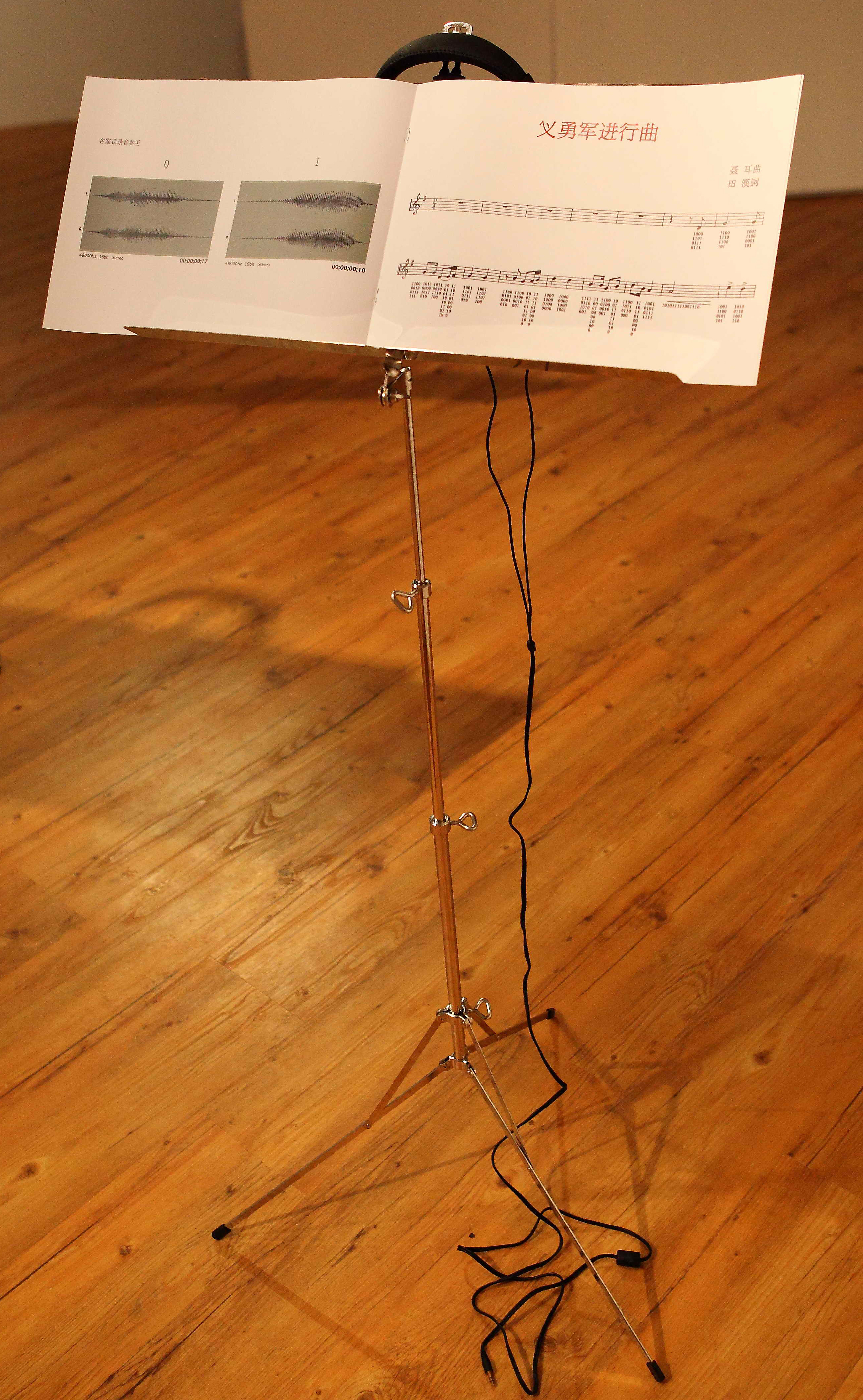 “義勇軍進行曲”是我國的唯一法定國歌,中國形象的象徵。二進位編碼系統”Binary Numeral System”是一種只以”1”和”0”這兩個符號構成的表意方式,亦常用於電腦程式系統,基本上沒有特定指涉的國家文化背景。當一個國家用兩個制度去理解的時侯,那又是一種如何的狀態。 於是將國歌歌詞硬梆梆地透過電腦程式(Binary to text)解碼為二進位編碼,並收錄了五位香港人用他們的鄕音方言朗讀”1”和”0”,再隨著國歌的節奏把一串串代表歌詞的編碼讀出。. 由於沉長的編碼需於極短時間內讀出以配合曲調節奏,不但使歌詞發音因壓縮過度變得怪異,而且經過複雜的解碼重構,”歌詞”已變得令人難以理解及詮釋。人們唯一能夠認知這是一首中國國歌,便只有那經典的管弦樂伴奏。雖然這首歌變得刺耳難明,但其基本內容並沒有改變,依舊是聶耳的曲,田漢的詞。問題在於用兩個制(鍵)的演繹方式和不同人從自己的角度閱讀這兩制。這便是我明白的”一國兩制”吧。
